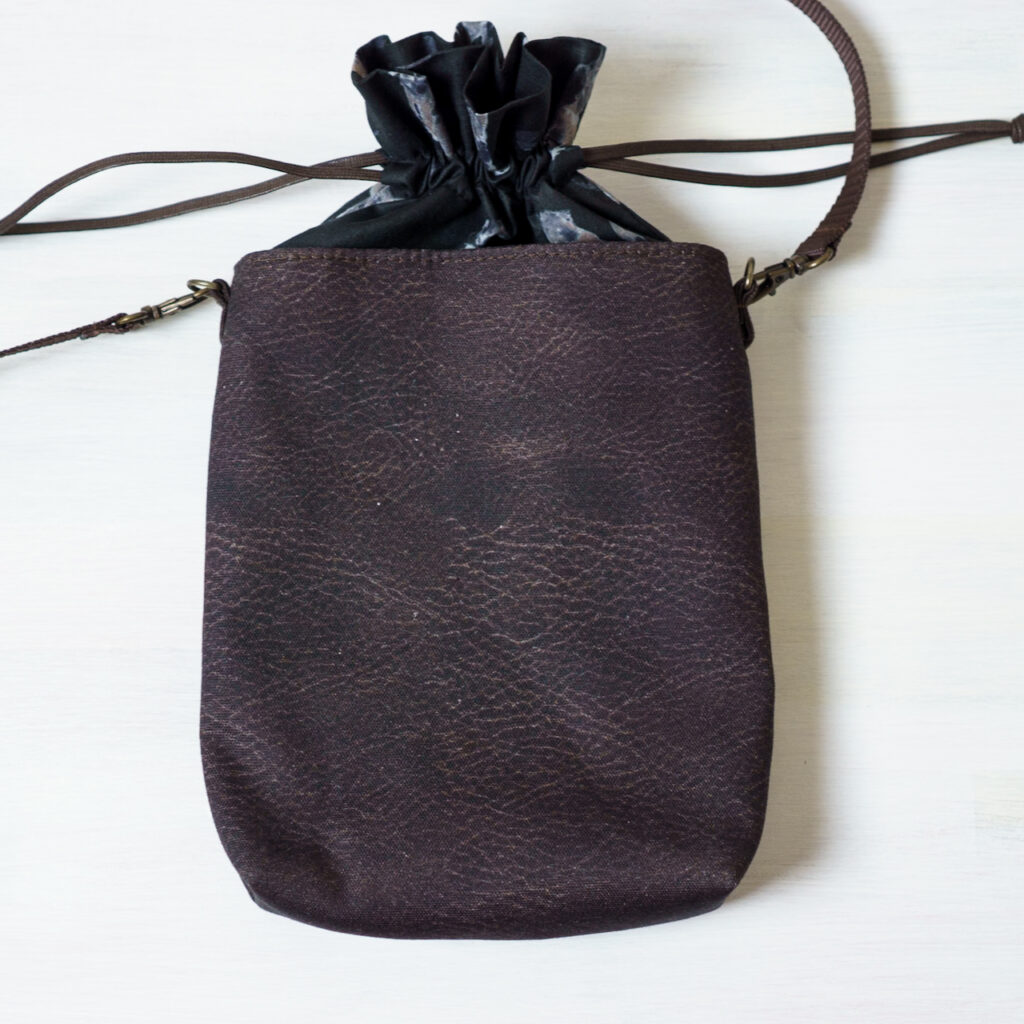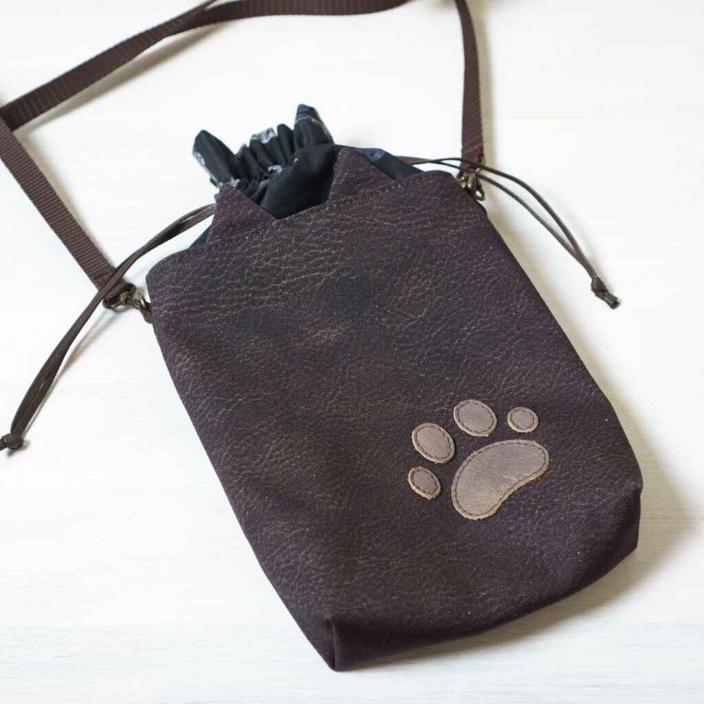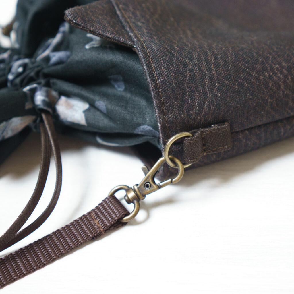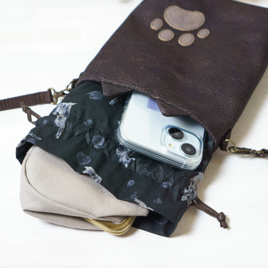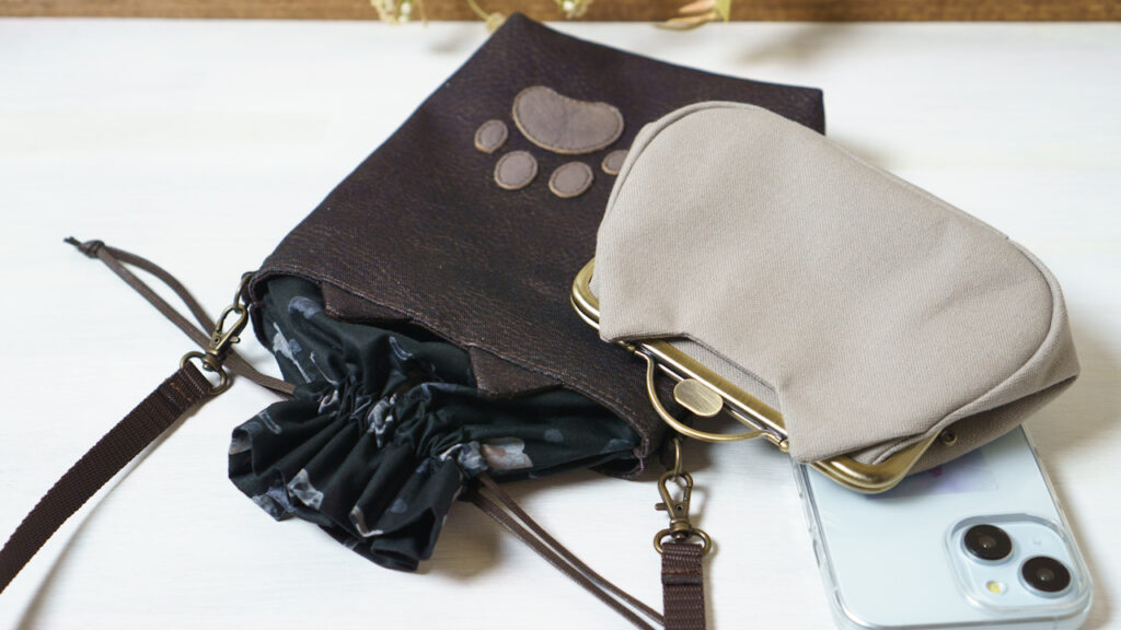 巾着部分は紐で閉じられるので、お財布や鍵などを入れておけます。