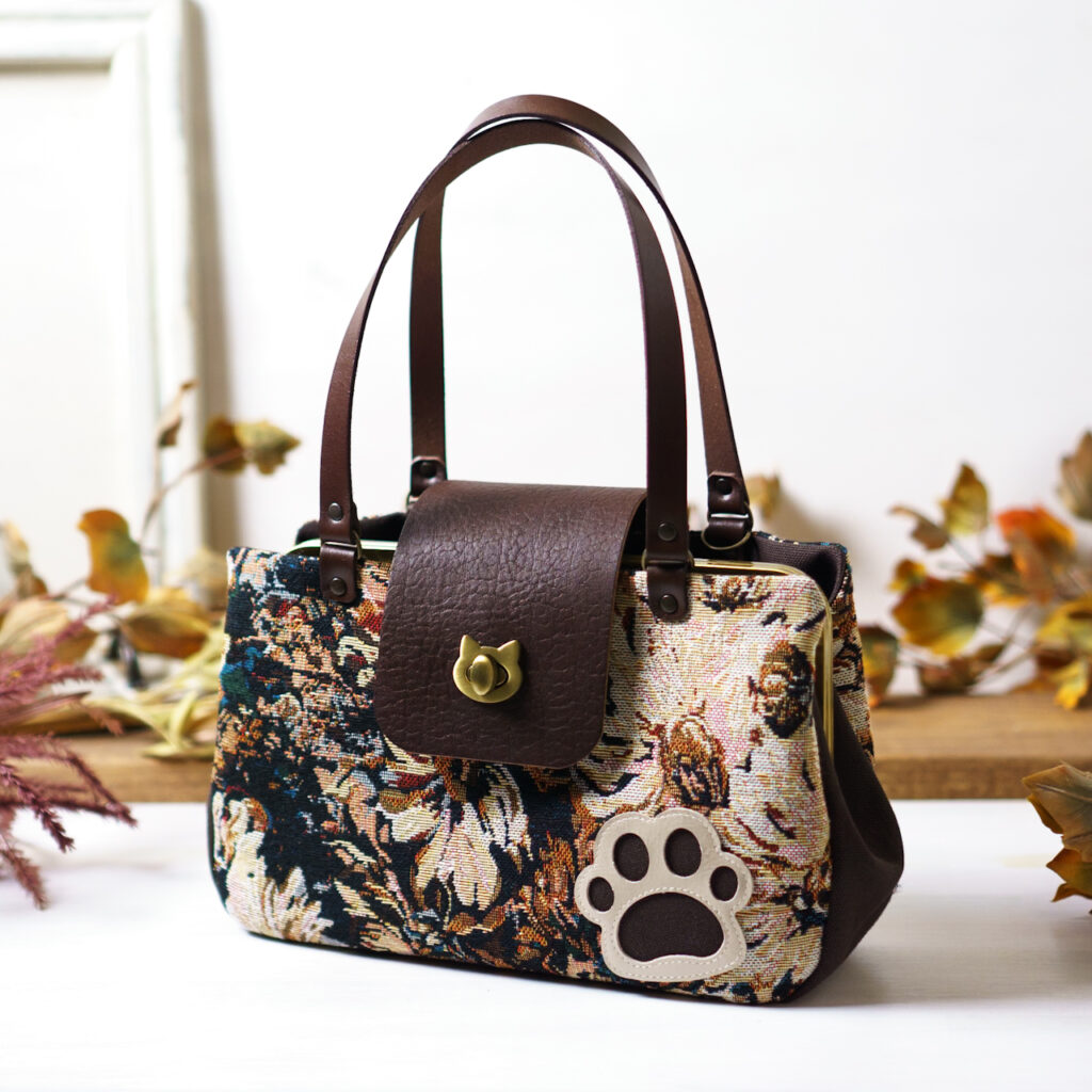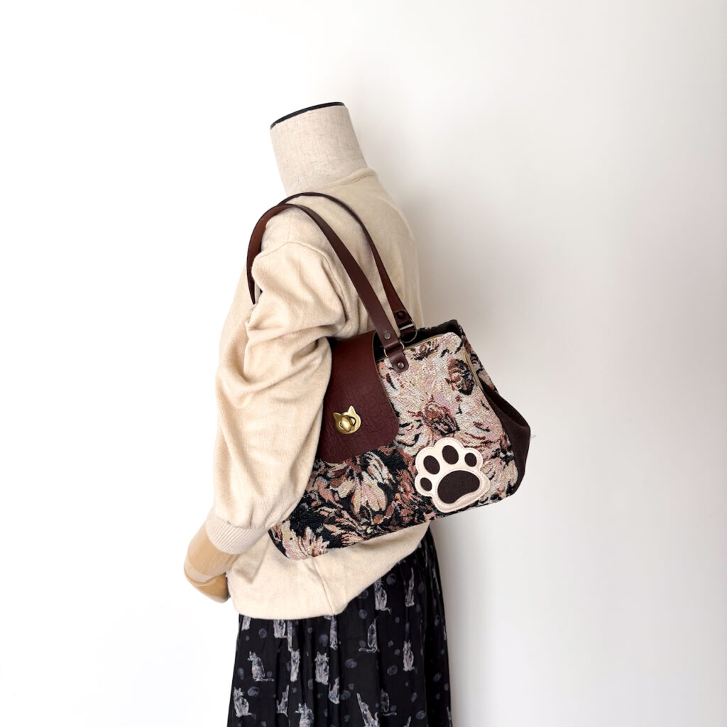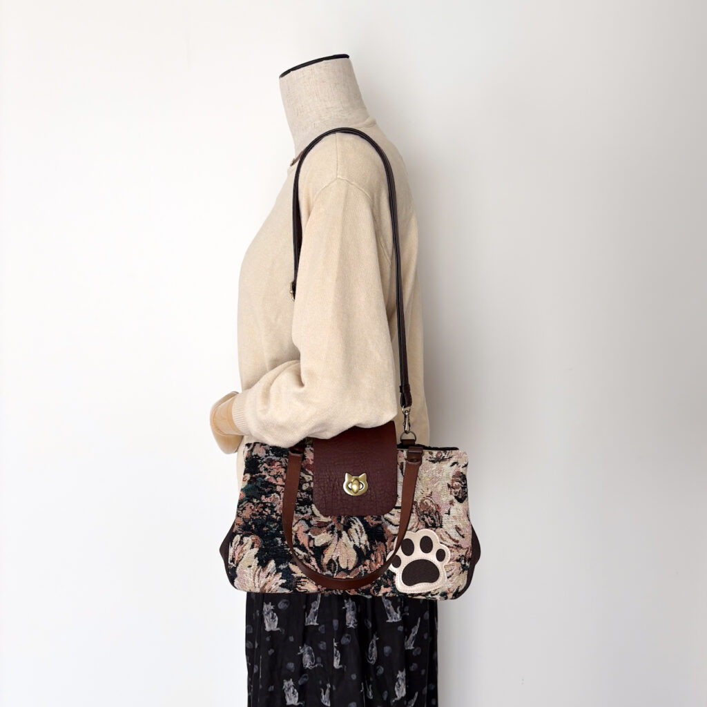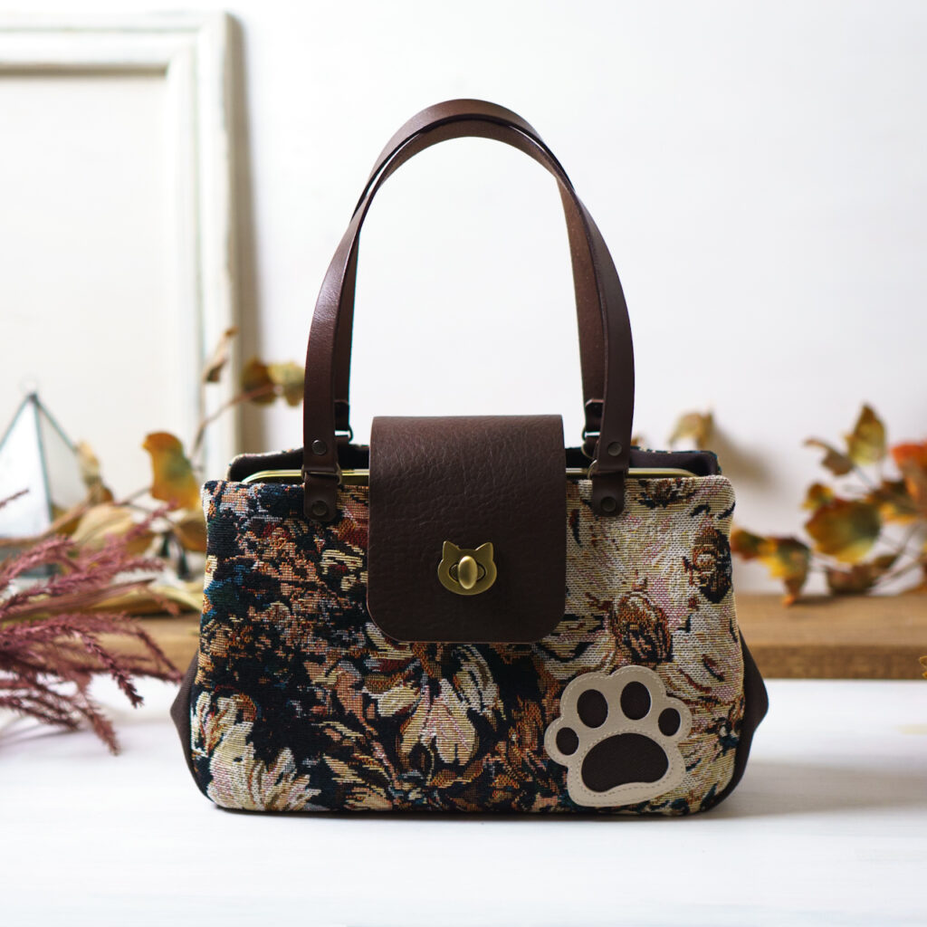 ブラウンフラワー・猫がま口ボストンバッグ