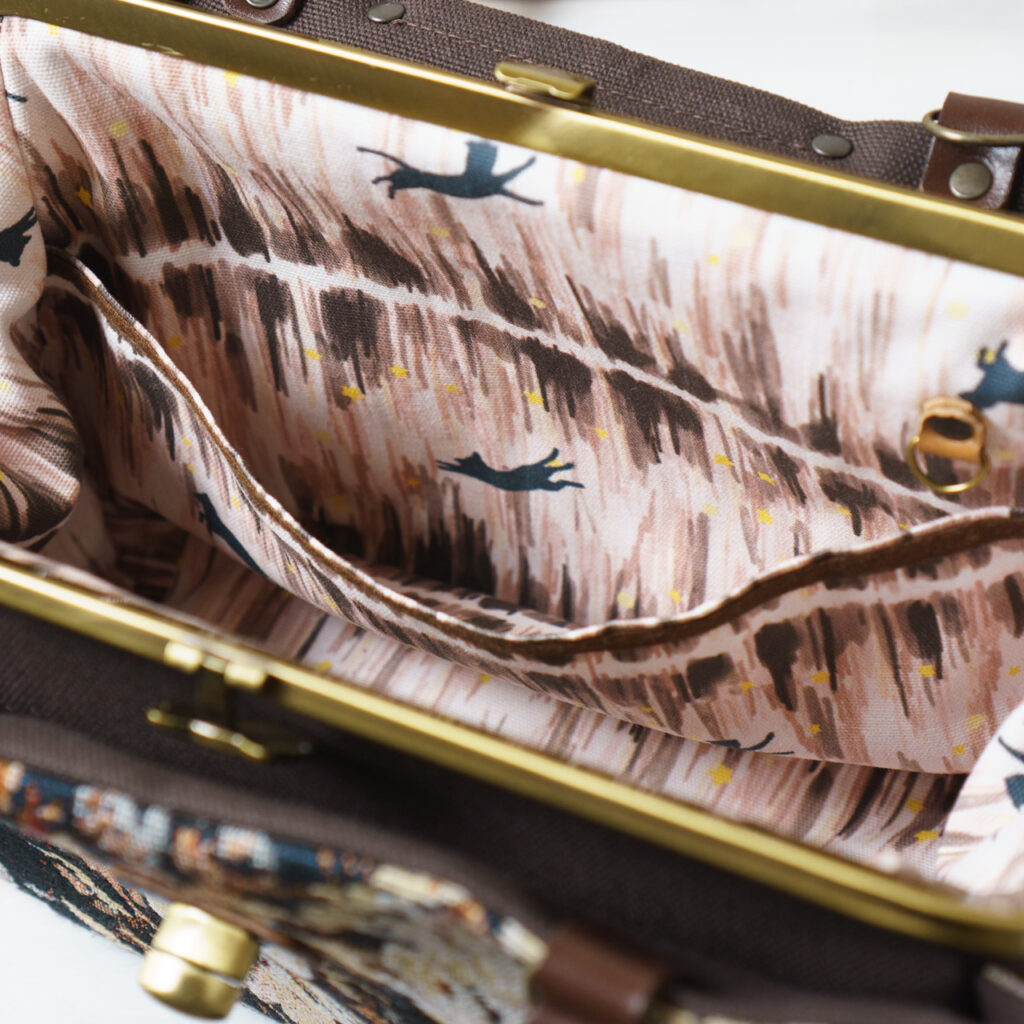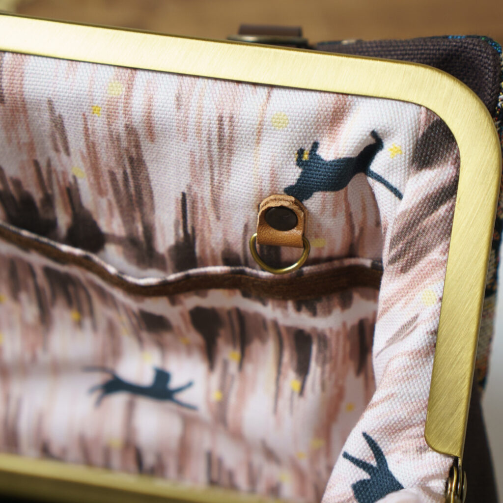 外ポケットは大きめにとってあり、がま口と同じ高さでありつつ、入れやすい構造にしています。