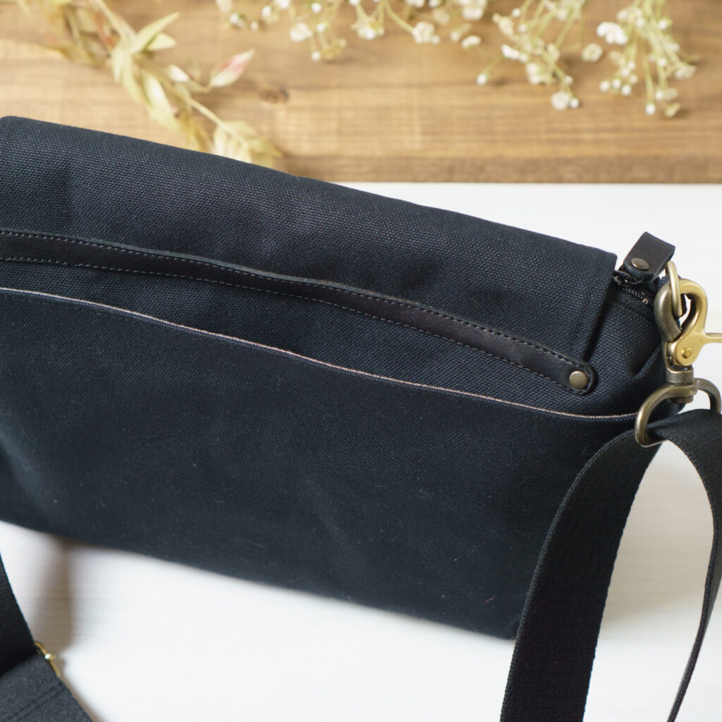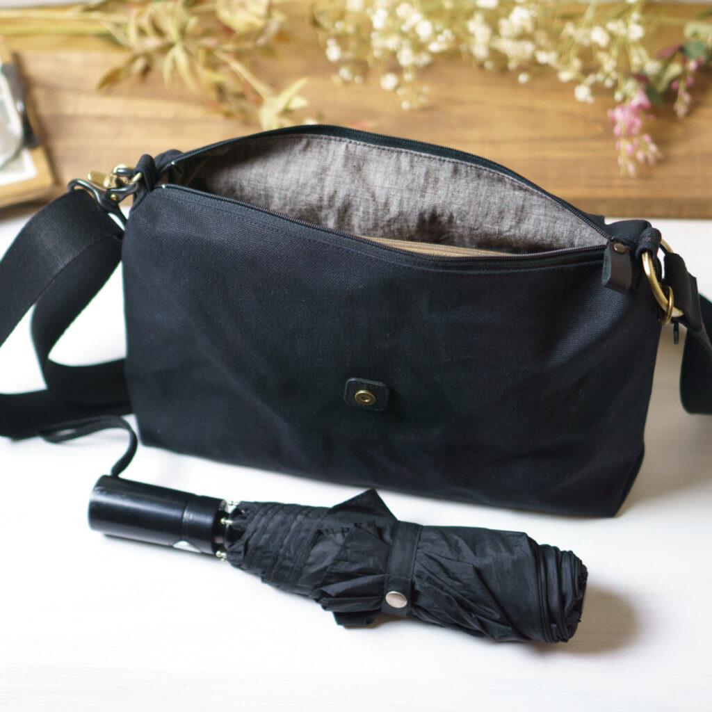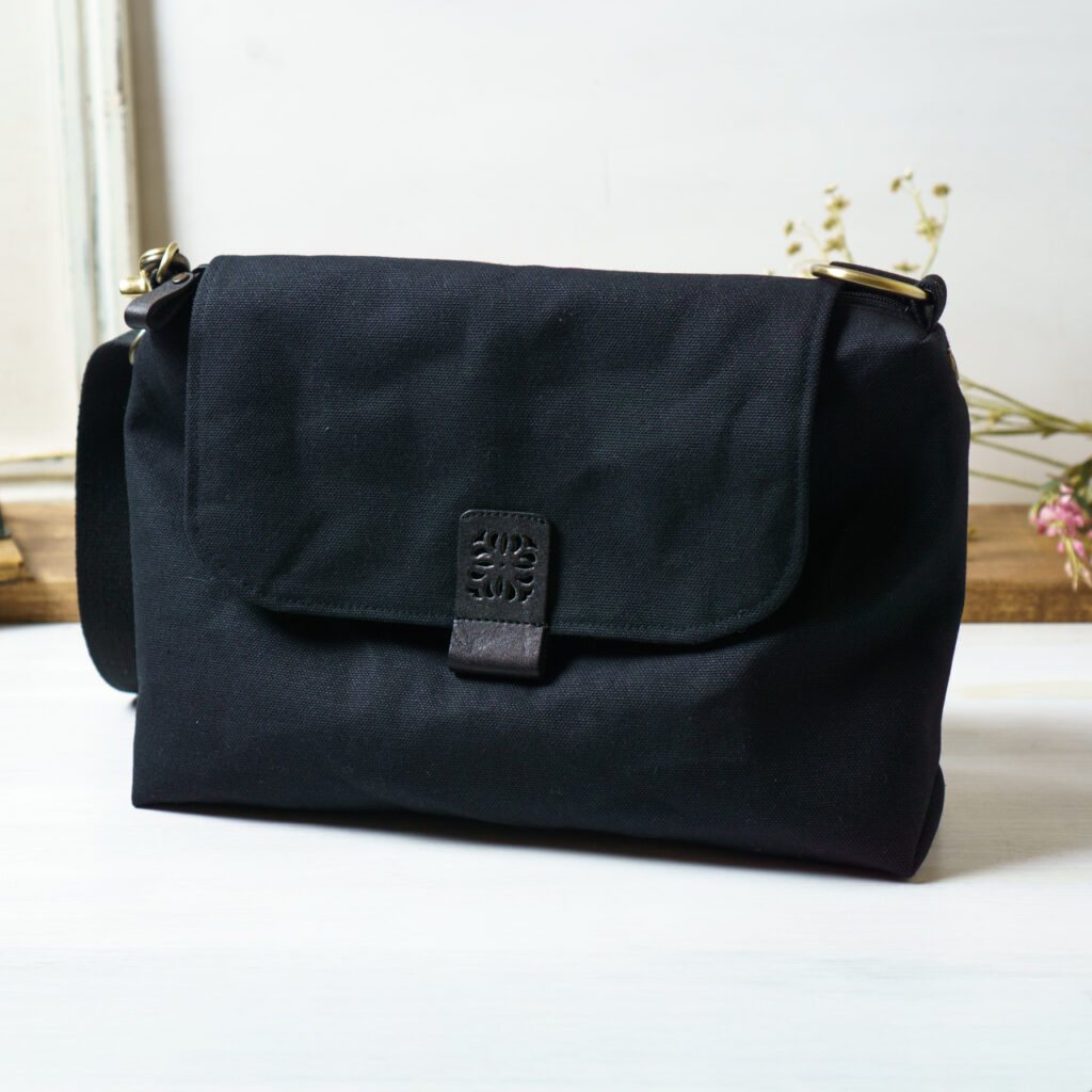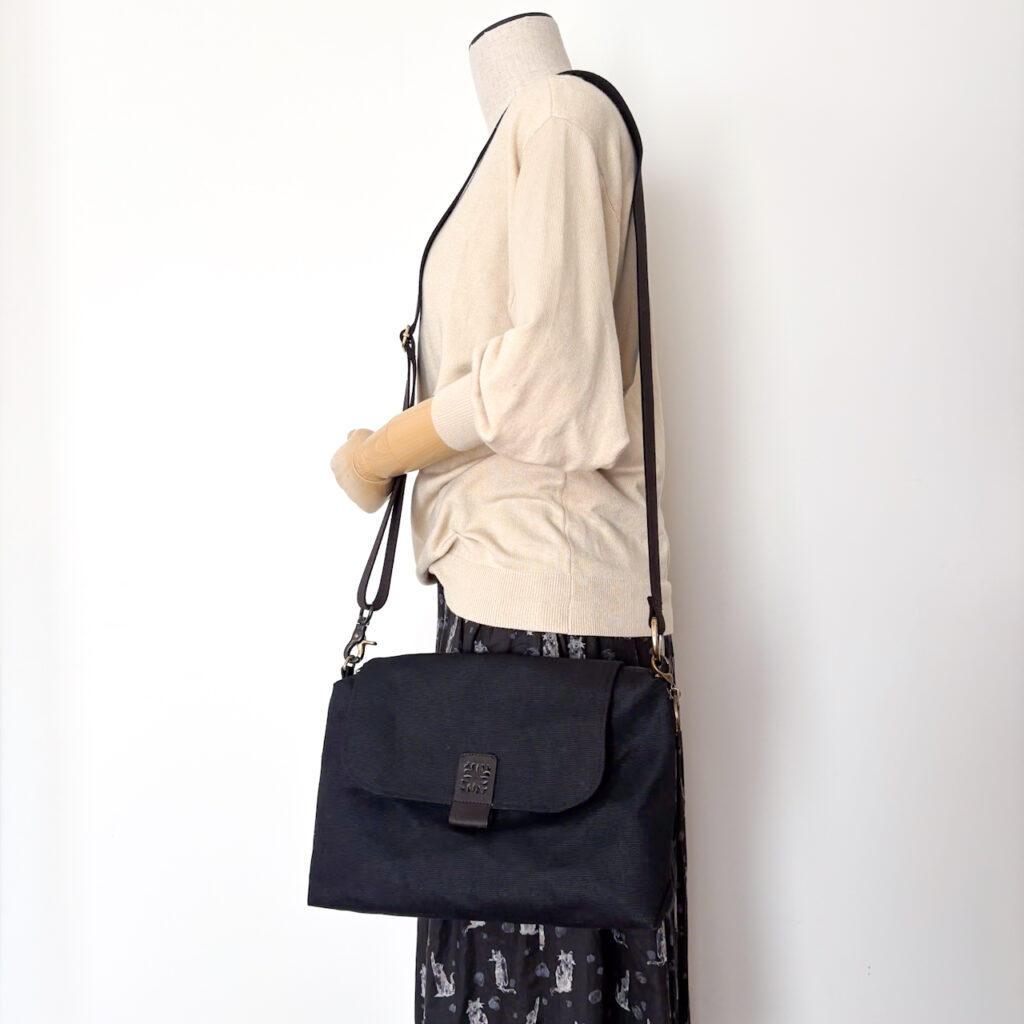 帆布、革、ショルダー紐を黒で統一しつつ
