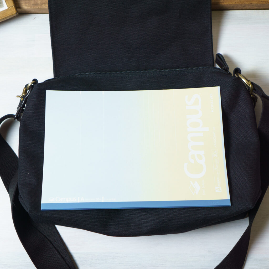 猫のファスナーポーチやB5ノートなど入ります。iPad11インチも入りました。